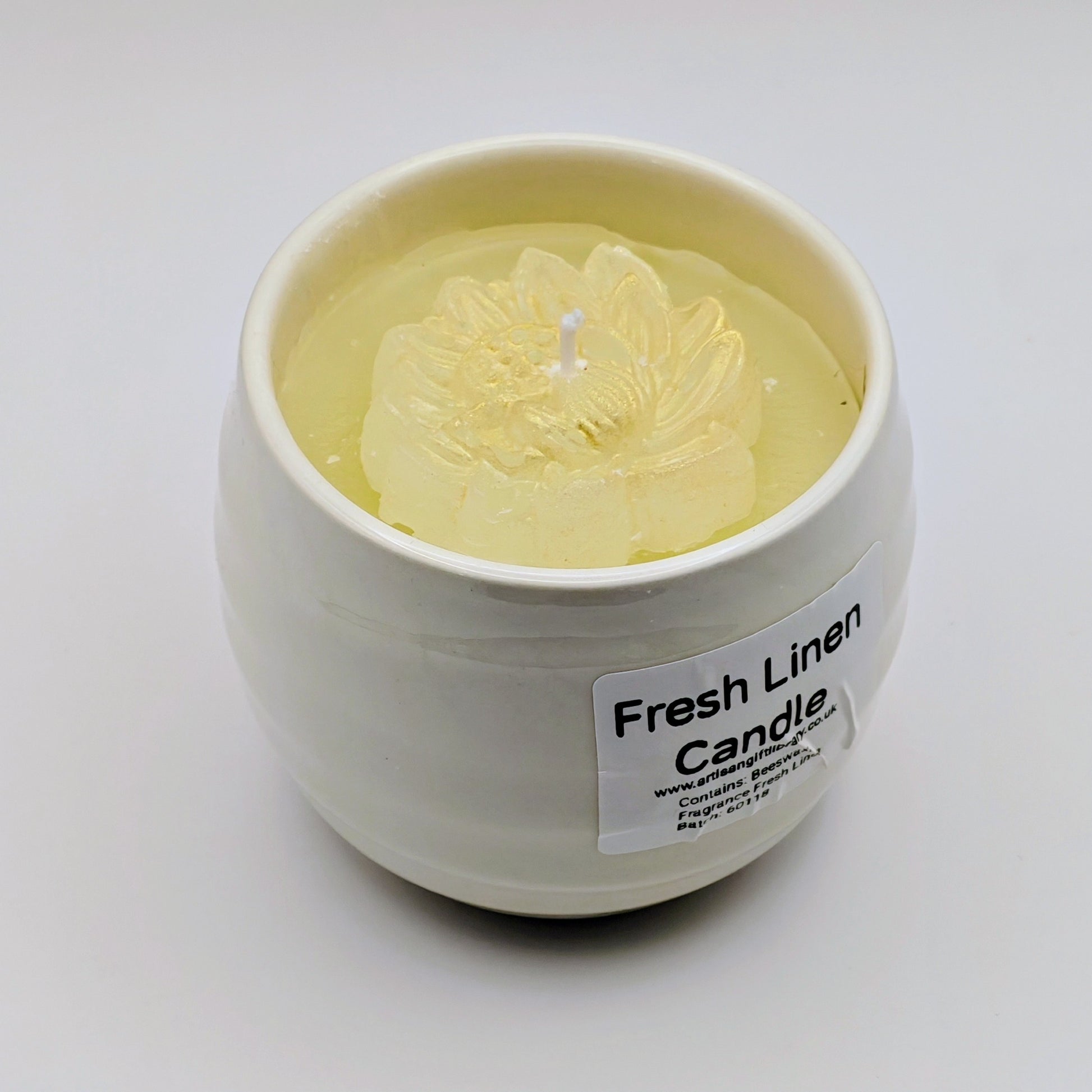 A Fresh Linen fragranced candle in a pottery lidded jar which is perfect for reuse. Gift ready.